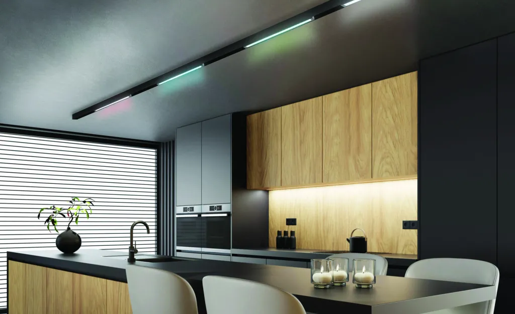 W salonie szynoprzewody mogą pełnić rolę głównego oświetlenia lub służyć jako doświetlenie wybranych stref, takich jak kanapa, obraz, biblioteczka czy strefa jadalniana. Dzięki możliwości montażu systemu w różnych kształtach, takich jak linia prosta, litera L czy U, szynoprzewody można łatwo dopasować do układu pomieszczenia. To doskonałe rozwiązanie w salonach, gdzie często potrzebne jest zróżnicowane oświetlenie w zależności od aktywności - od relaksu na sofie po wspólne posiłki przy stole. Również w kuchni sprawdzają się wyjątkowo dobrze. System ten pozwala na oświetlenie blatów roboczych, wyspy kuchennej czy szafek, eliminując konieczność montowania wielu oddzielnych opraw. Elastyczność szynoprzewodów pozwala na precyzyjne skierowanie światła tam, gdzie jest najbardziej potrzebne, a w razie potrzeby można łatwo dodać lub przesunąć lampę, aby idealnie dopasować oświetlenie do zmieniających się warunków w kuchni.